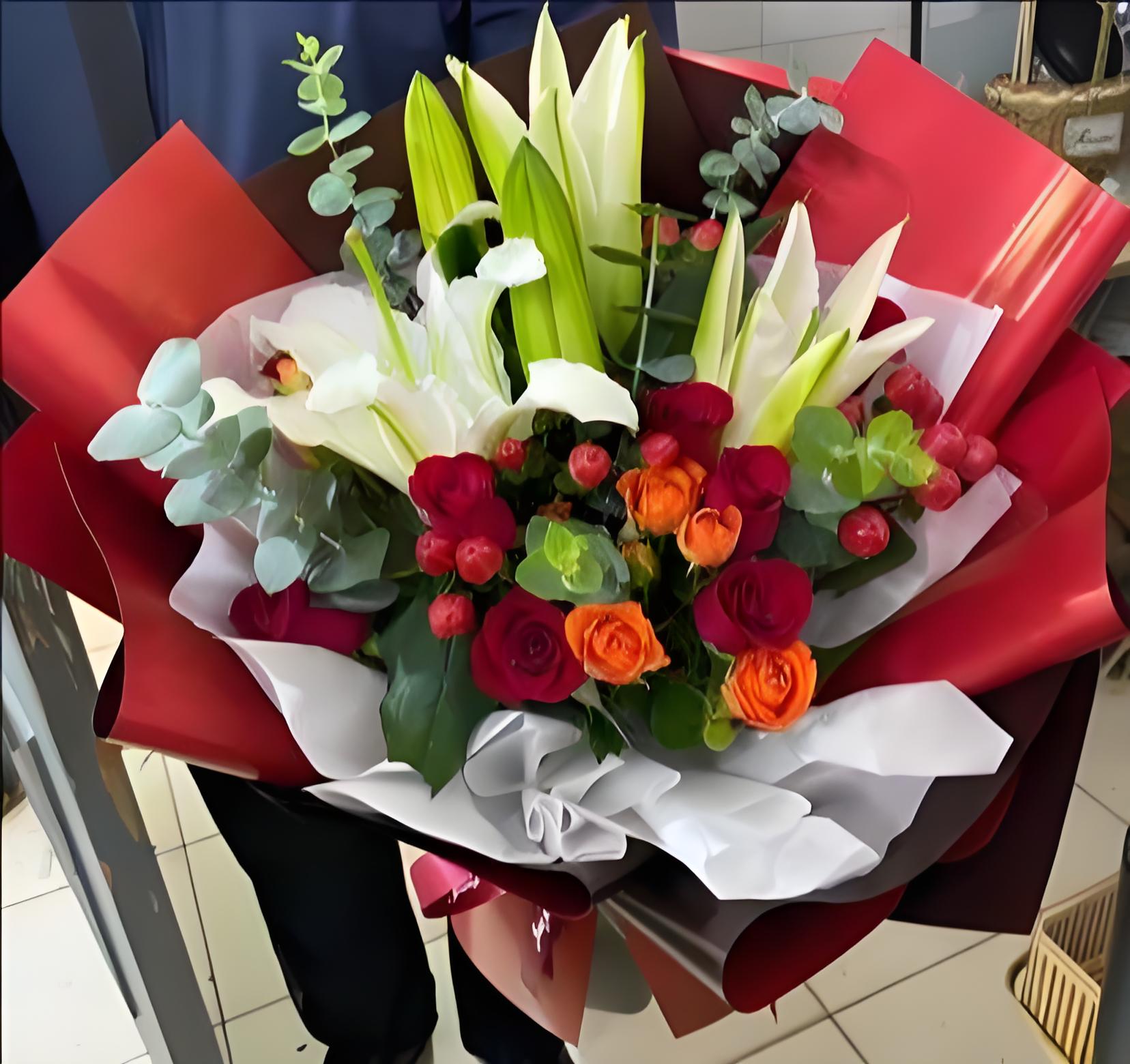 大连庄河市花店包11枝红玫瑰、2枝多头白百合、6枝橙色多头玫瑰、红豆、尤加利叶